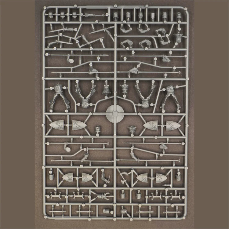 This hard plastic box set features 12 barded horses and riders with weapons including lance, sword, ax, and mace and with arms that are fully compatible with WAAAC001 Foot Knights for even more variety! 21 unique heads allow for massive customization. And we’ve also included jousting lances if you’d like to take your knights to a friendly tournament!