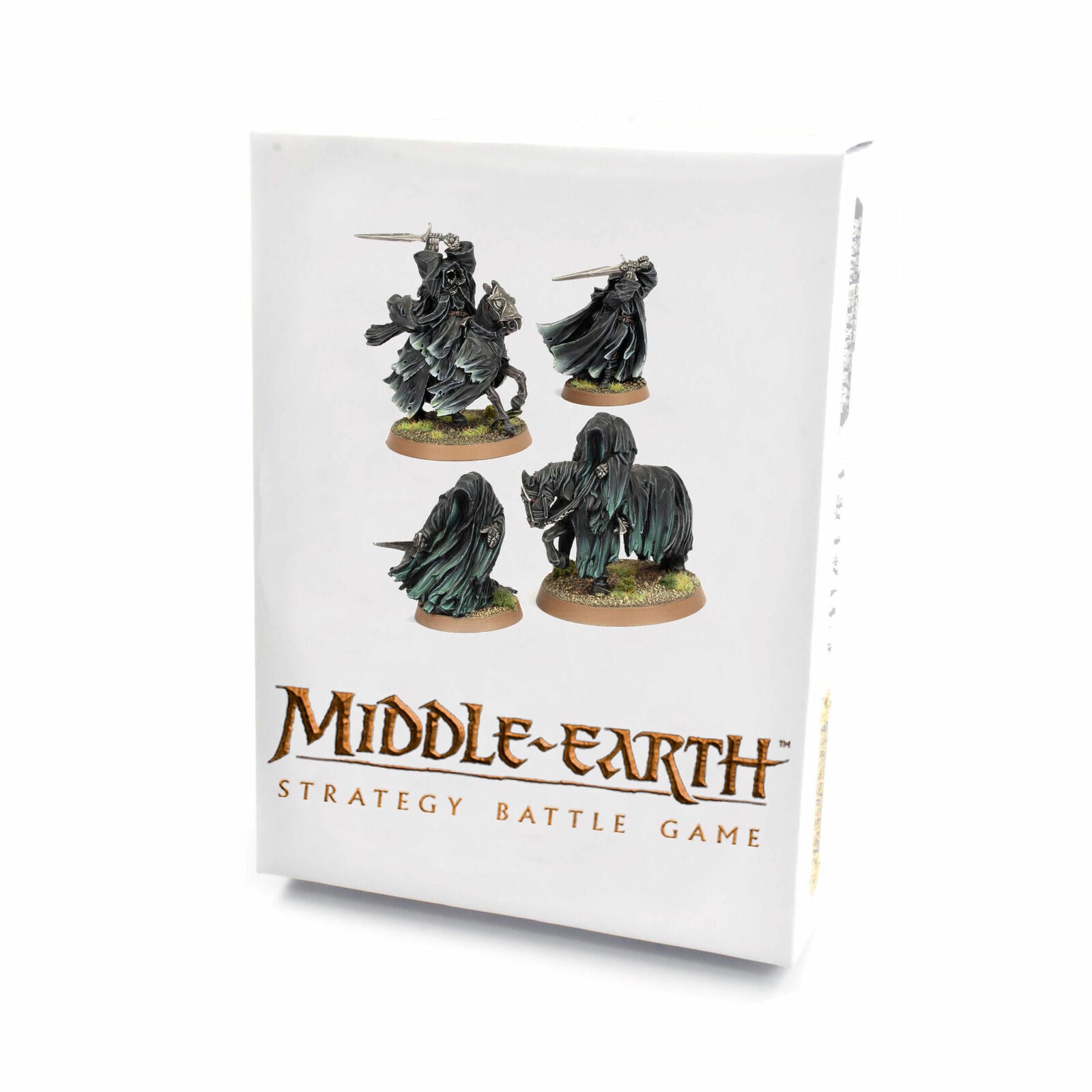 Cet ensemble contient quatre Spectres de l'Anneau en métal : 1x Le Souillé monté, 1x Le Souillé à pied, 1x Le Dwimmerlaik monté et 1x Le Dwimmerlaik à pied. Chaque figurine est fournie avec un socle adapté.