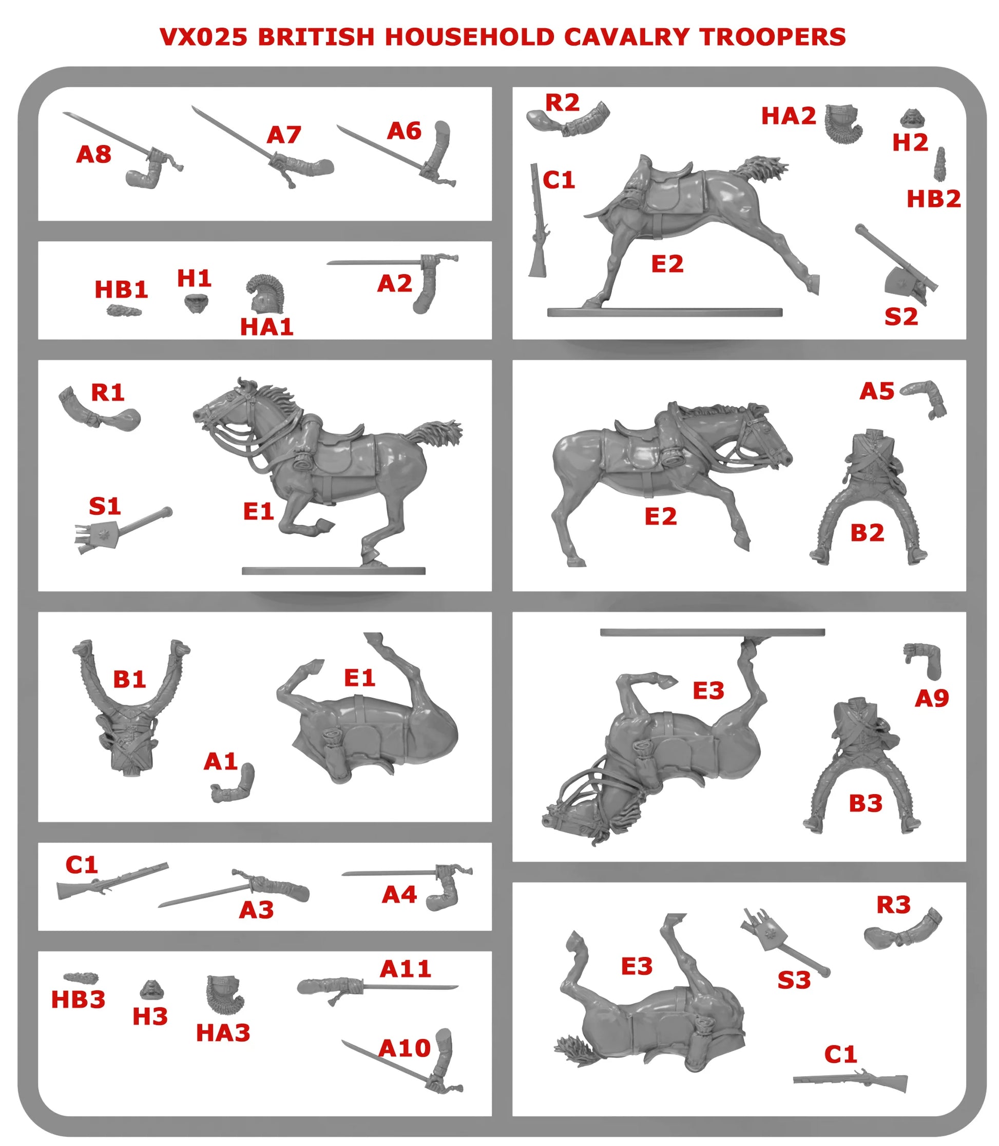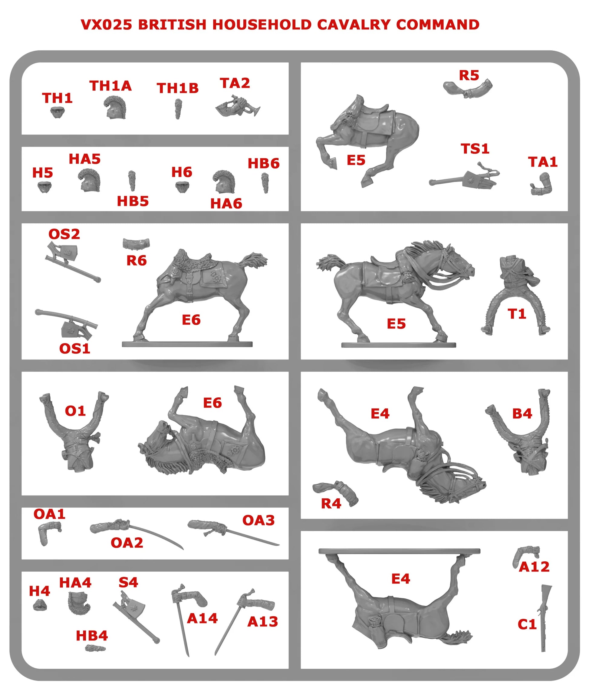 This highly detailed set has multiple head and arm options to make a varied and dynamic unit of charging British Household Cavalry, including a command frame with trumpeter and Officer.