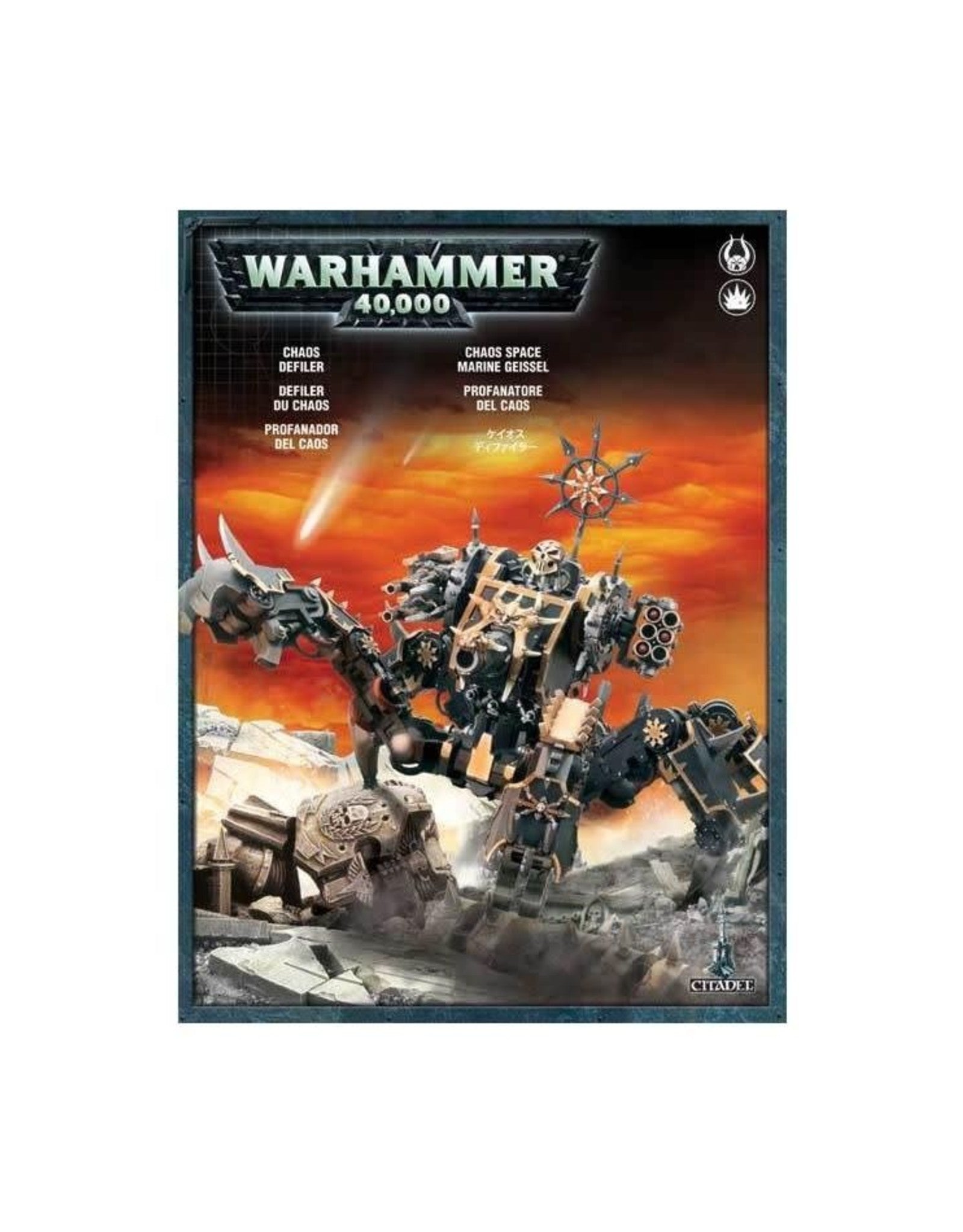 This super boxed set contains 1 multi-part plastic Chaos Defiler, including a twin-link reaper autocannon, heavy flamer and close combat weapons.