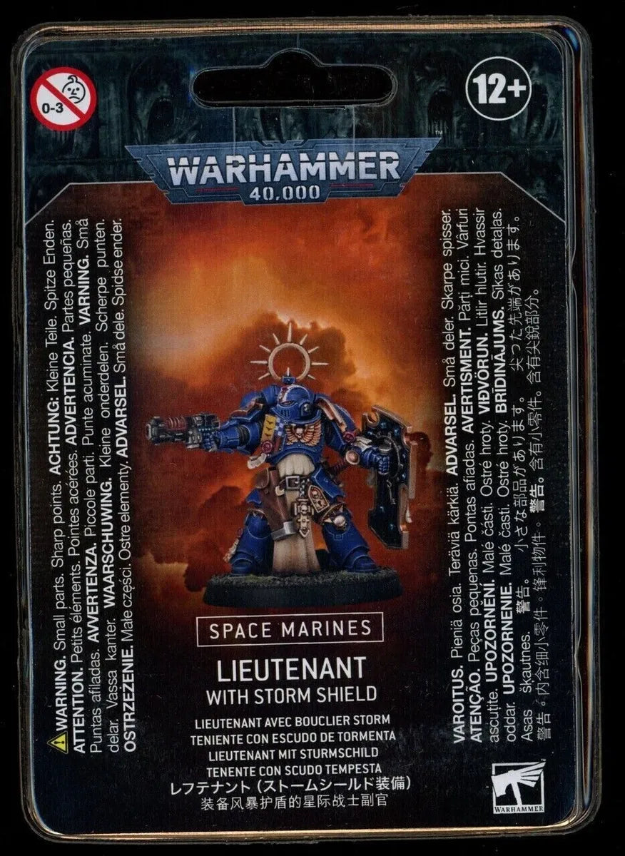 This multipart plastic kit builds one Space Marine Lieutenant carrying a storm shield, a skilled sub-commander of the Adeptus Astartes. He also carries a rare and exotic neo-volkite pistol, with a sheathed power sword at his hip. This aggressive leader's armour incorporates a surcoat and is festooned with relics and symbols of status, marking him out as a clear veteran, while his storm shield is emblazoned with the sign of the Indomitus Crusade.