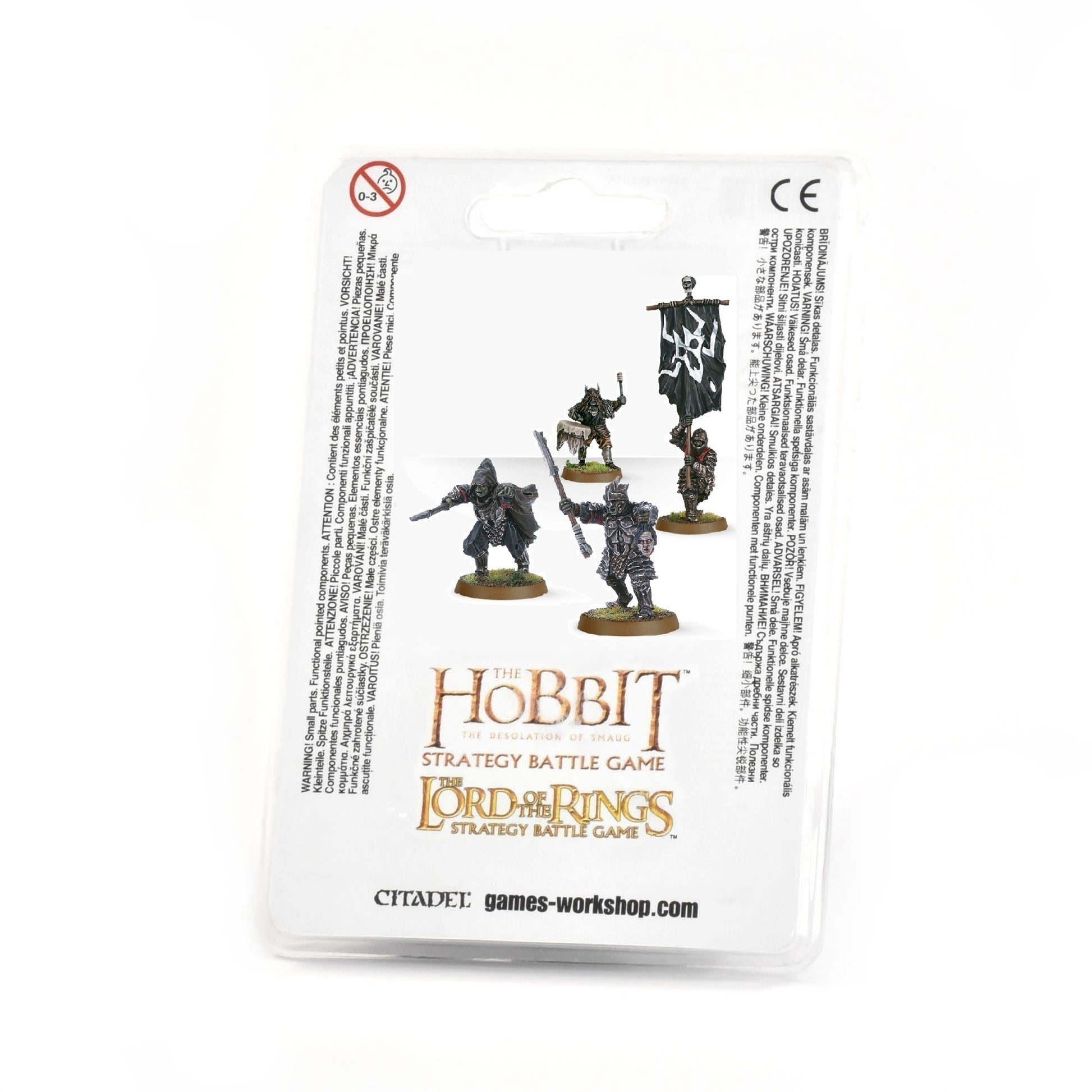 This boxed set contains a set of Morannon Orc Commanders. These models are resin cast miniatures, including an Orc Captain, a Drummer, a banner bearer, and a Morannon Orc Shaman. They are supplied as 8 separate components, and come with 4 25mm round bases.