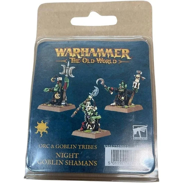 This multipart metal kit builds 3 Night Goblin Shamans – cunning and cruel magic-wielders for Orc & Goblin Tribes in games of Warhammer: The Old World. These shamans are shown armed with their individual shaman staffs and wearing Night Goblin cloaks featuring the crooked moon icon.