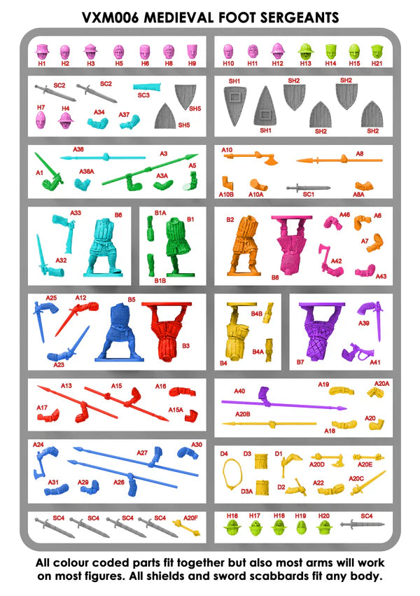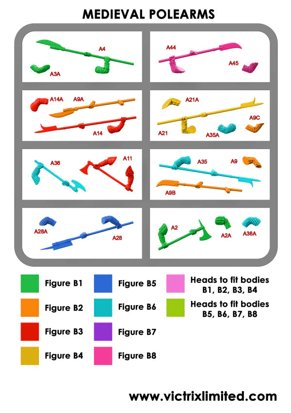 You will be able to freely mix parts from this set with the Victrix Foot and mounted Medieval Knights creating yet more variety in your armies and retinues.